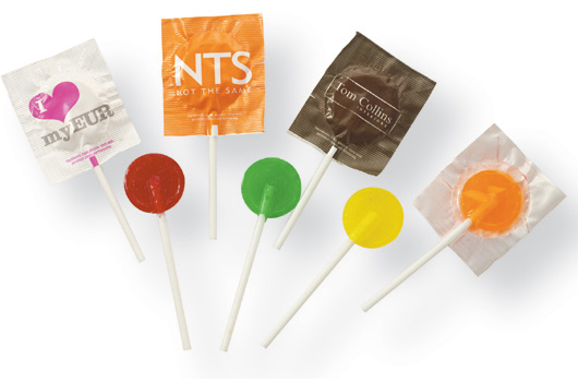 Sucette: Plate 6grs. Dimensions: 50x50mm. Cello: Blanc ou Transparent. Goûts: Fruits + Coca. Impression: 1 couleur.